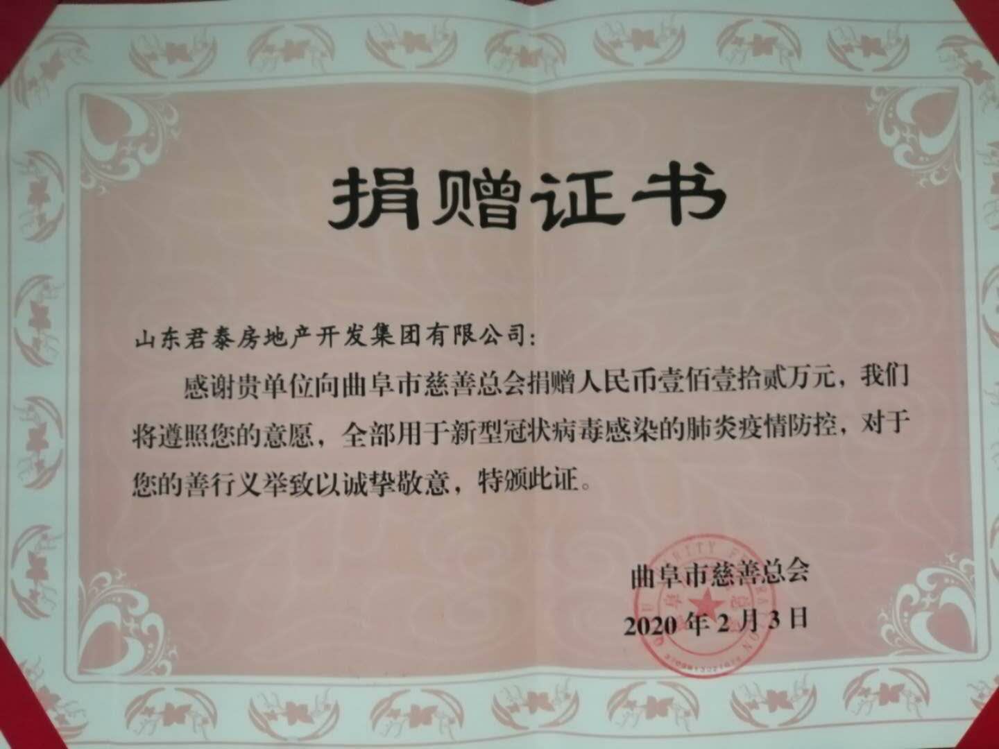 眾志成城,萬眾一心,抗擊疫情。在這全國疫情防控的關鍵時刻,山東君泰房地產(chǎn)開發(fā)集團有限公司于2020年2月3日向曲阜市慈善總會捐贈現(xiàn)金112萬元。君泰集團相信在黨和政府領導下,定能很快取得疫情防控工作的勝利。曲阜加油!武漢加油!中國加油!